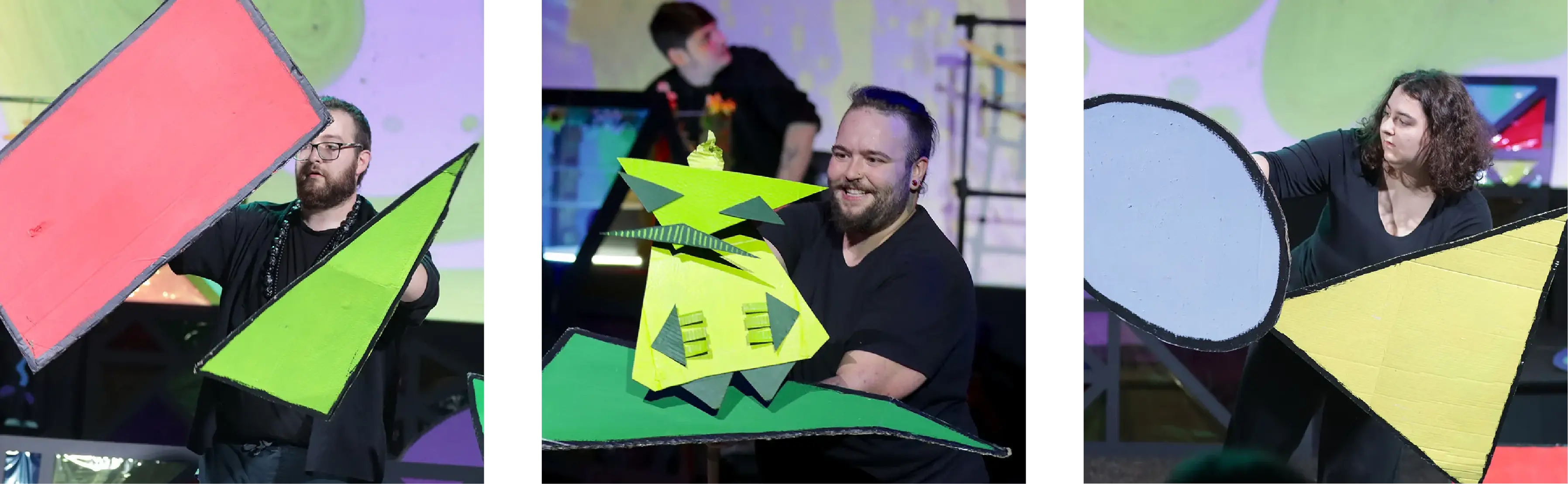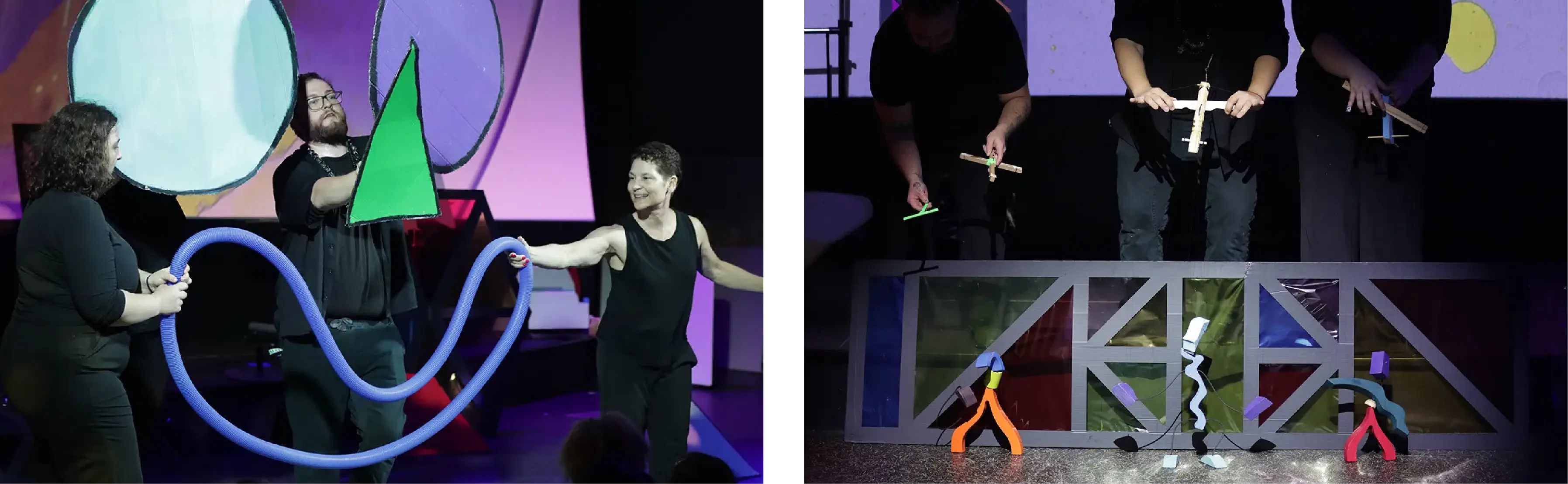 Abstract marionettes, lines, angles, color-fields, encounter one another, separate, reconnect.