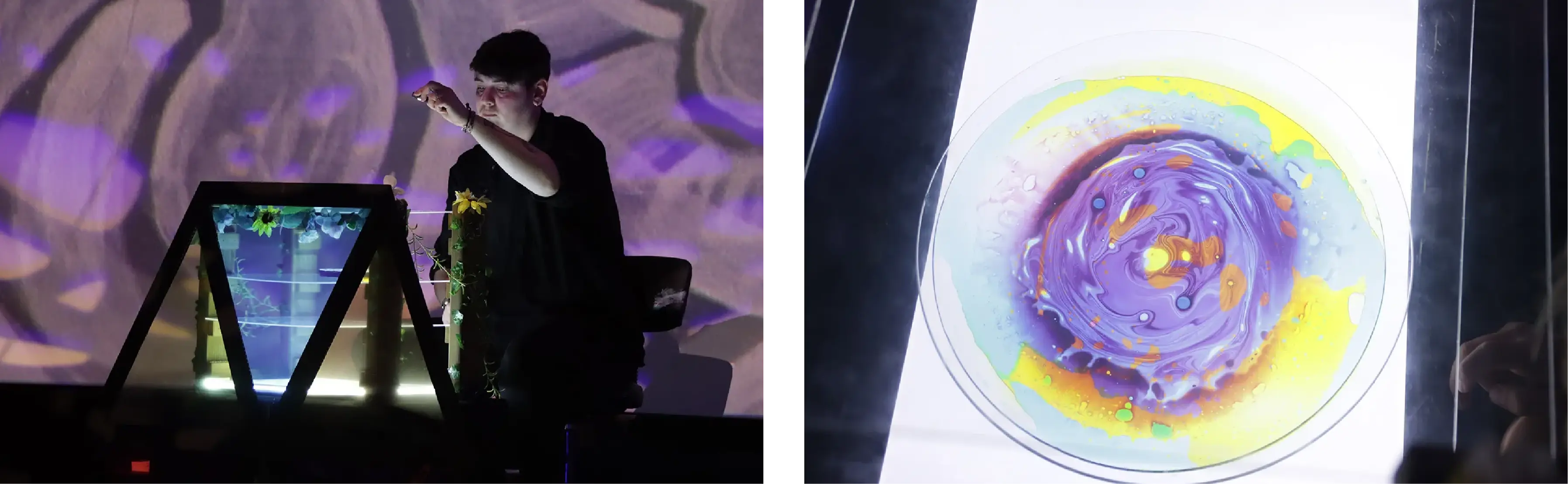 Overhead, large-scale forms hover: kaleidoscopic, shifting, almost architectural.